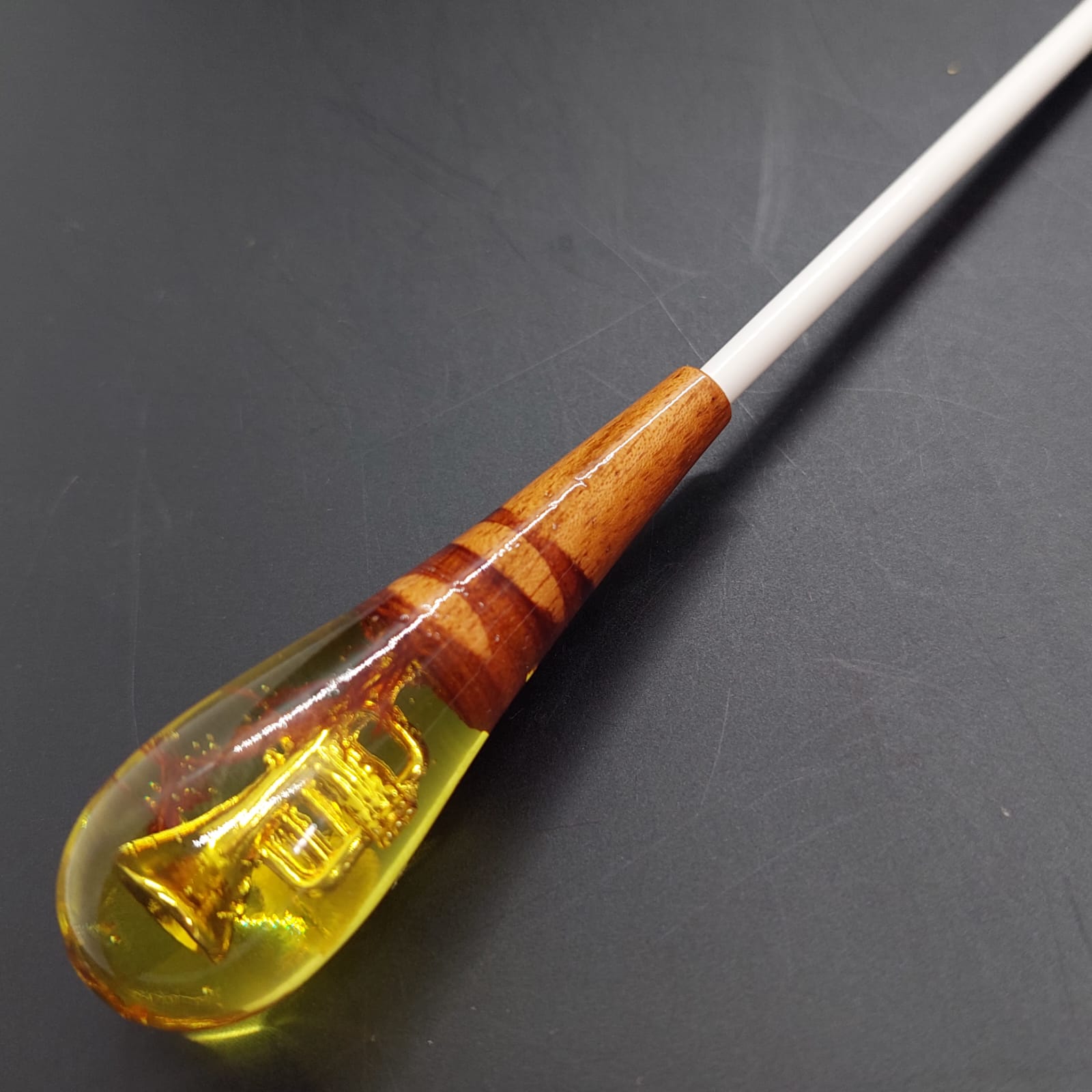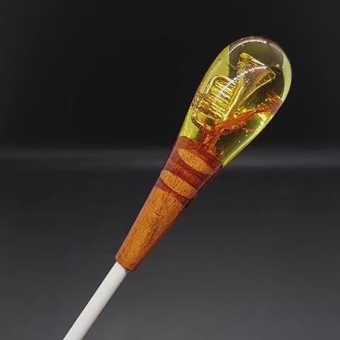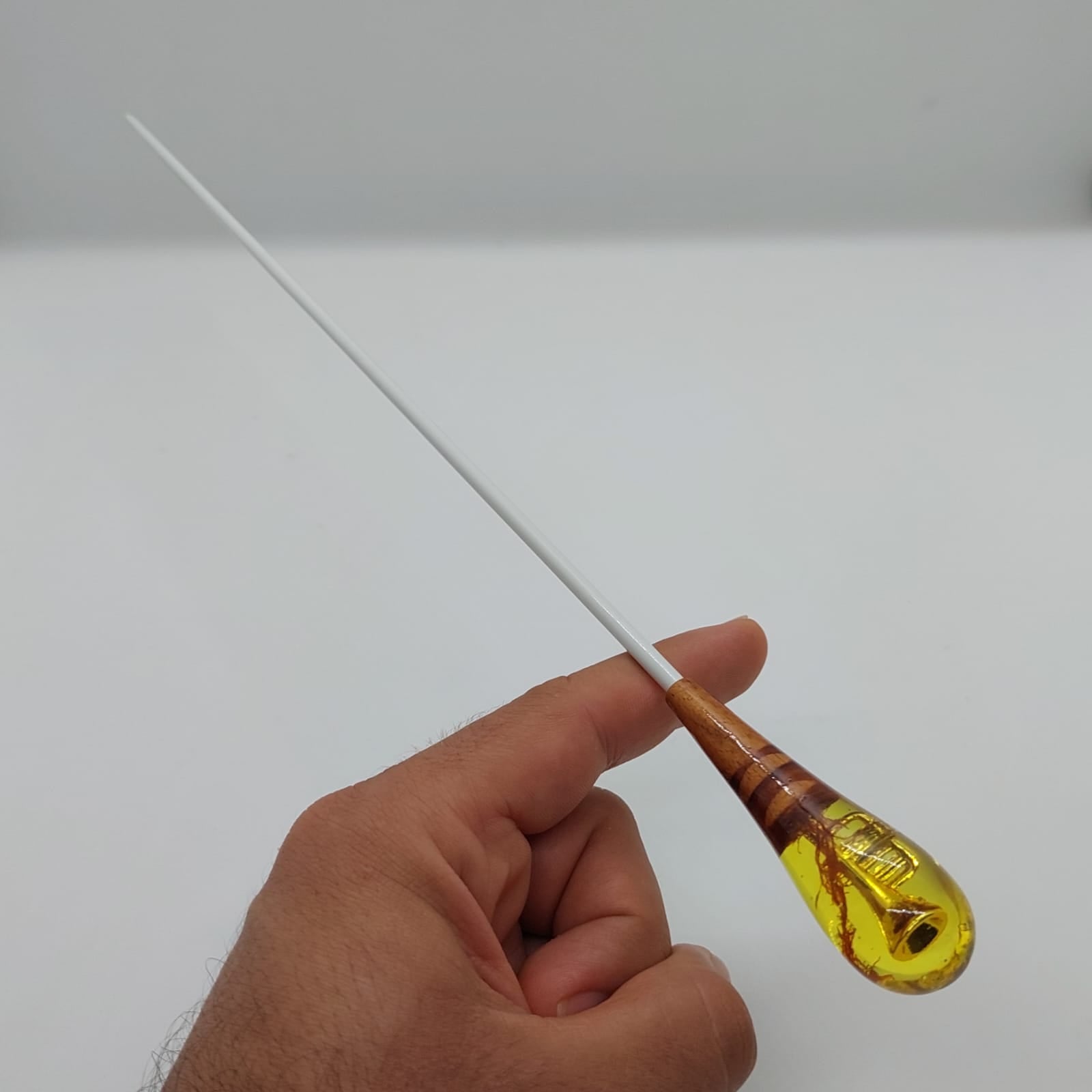 The baton handle is made from a delicate fusion of wood and resin, containing a miniature musical instrument inside. Each piece is unique, revealing charming details that pay homage to music, combining durability, originality, and a touch of sophistication for conducting.