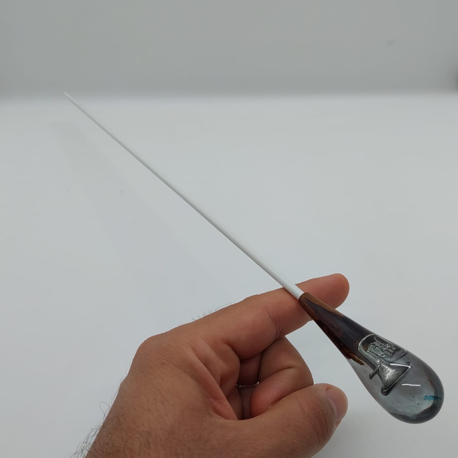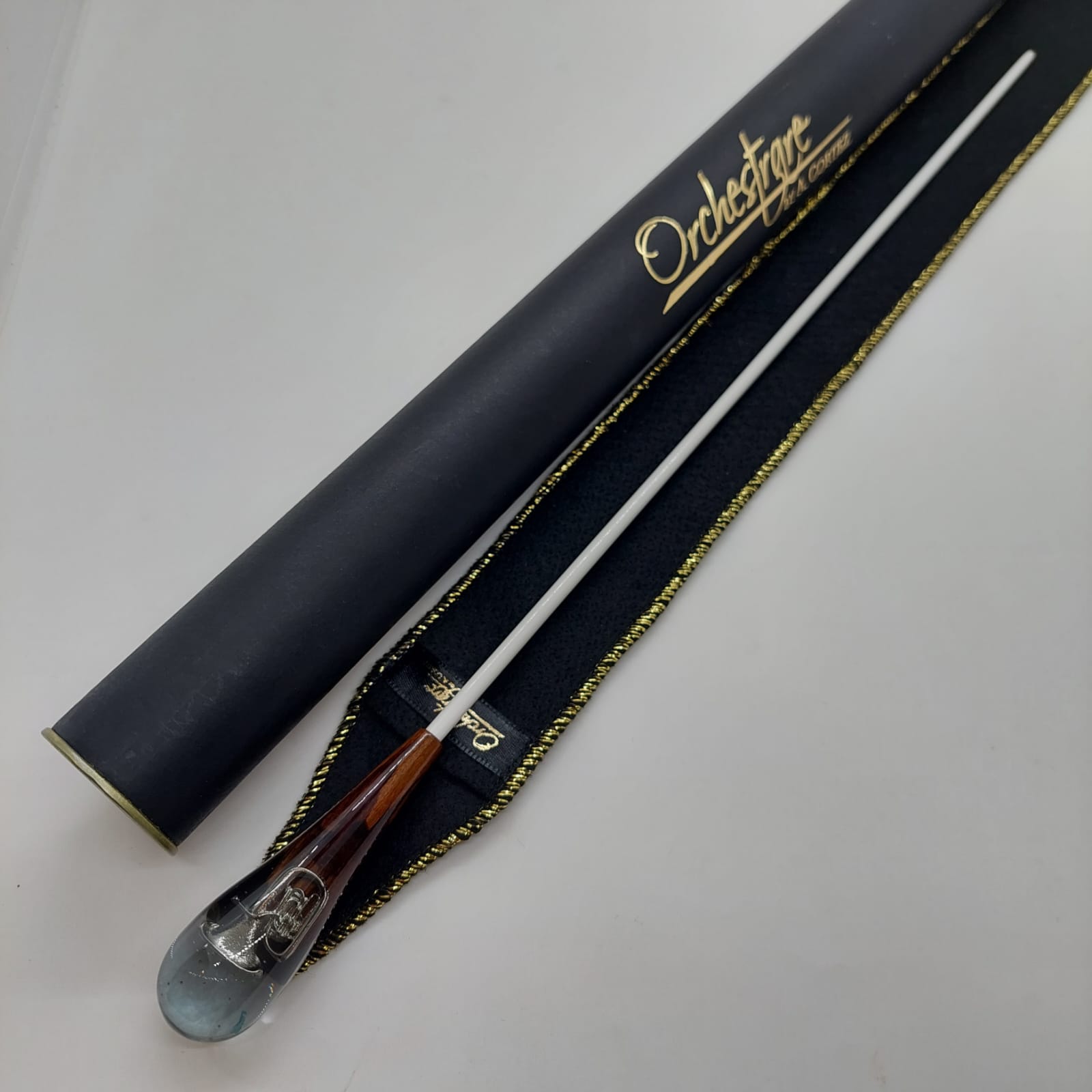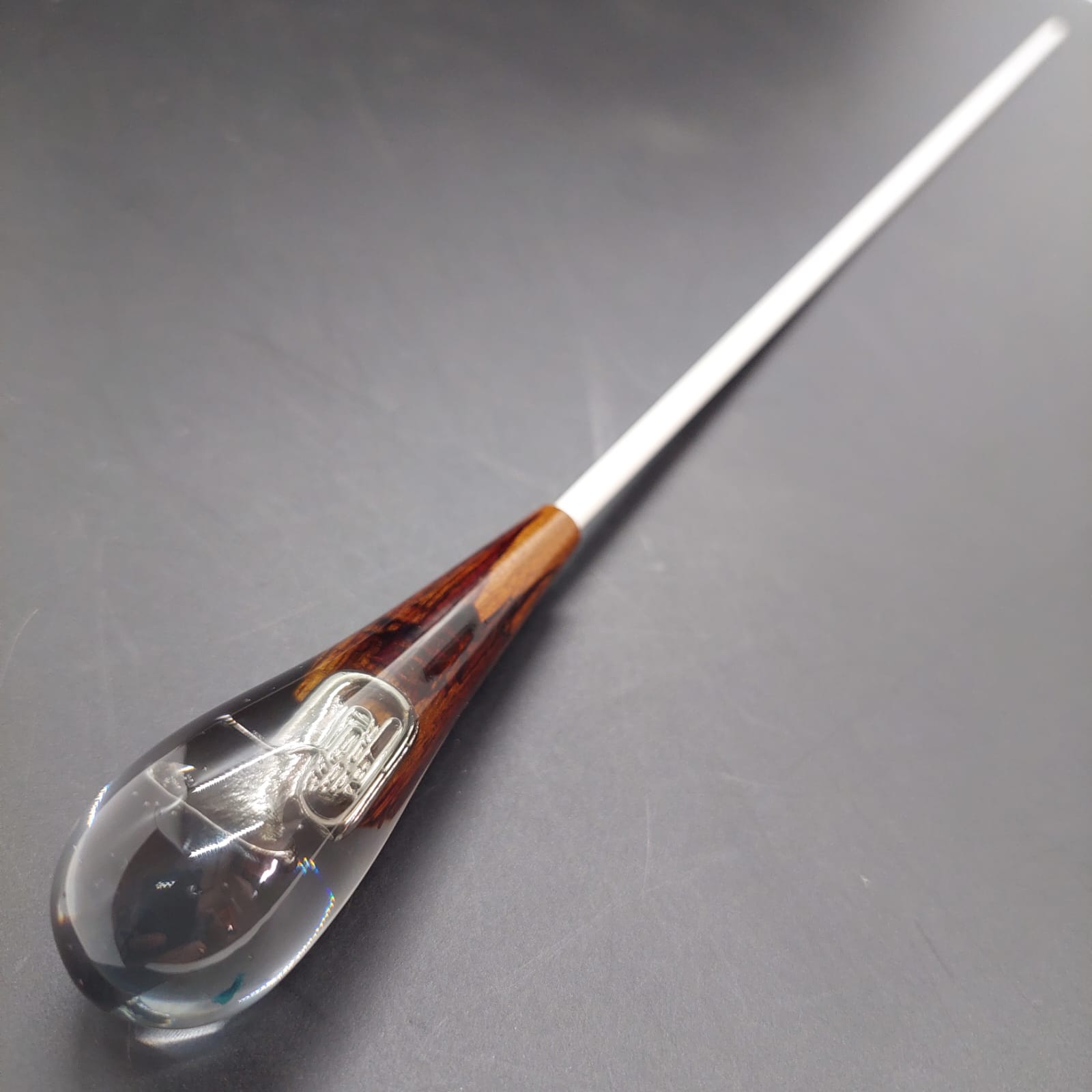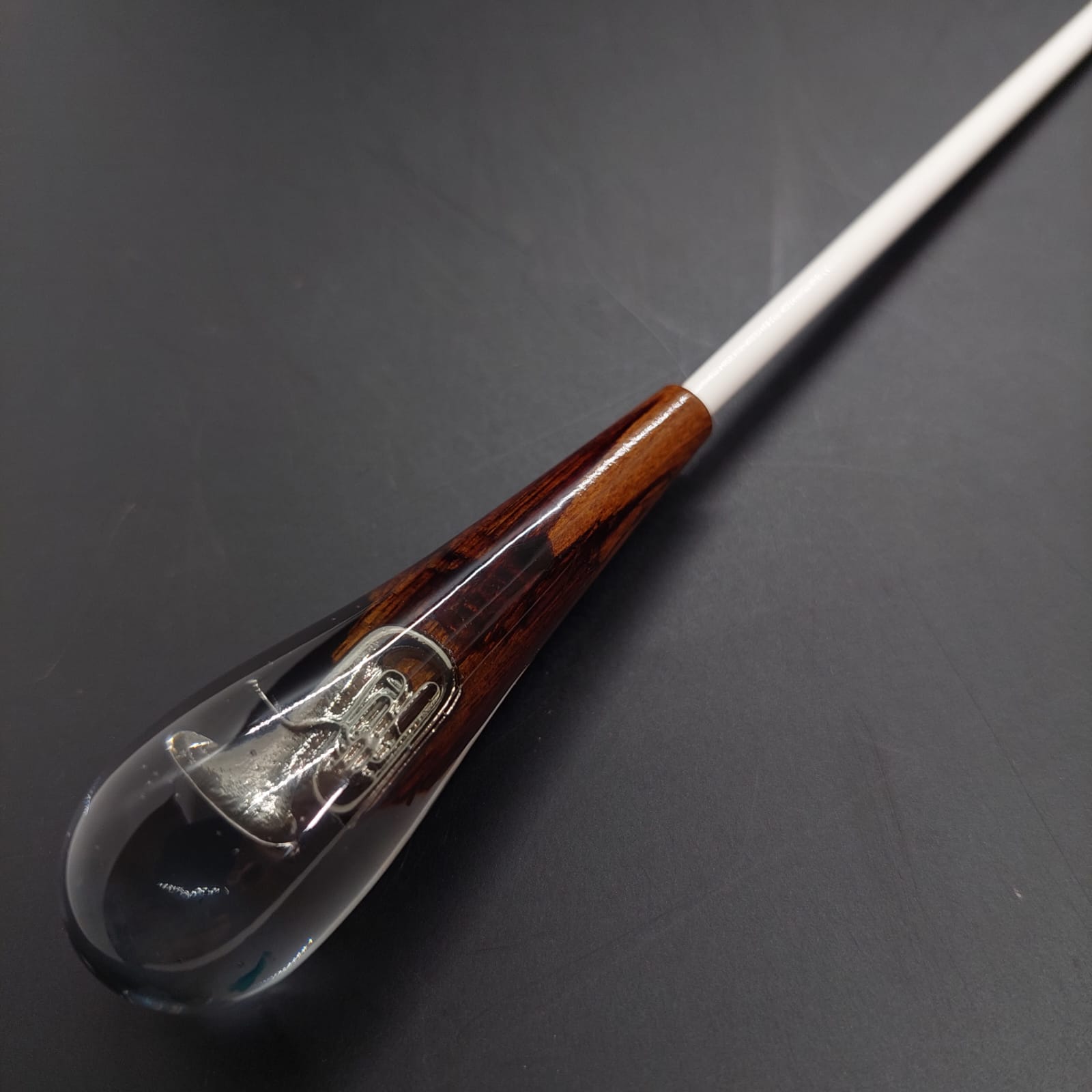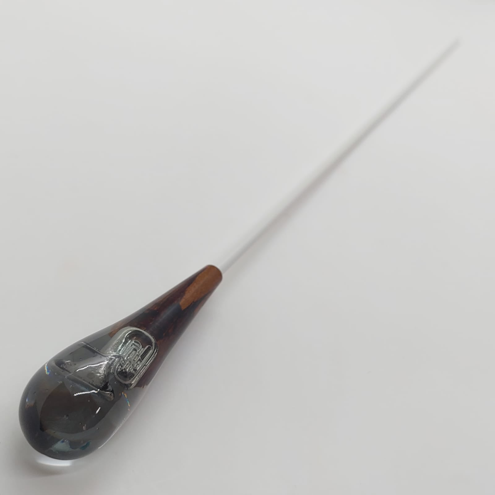 The baton handle is made from a delicate fusion of wood and resin, containing a miniature musical instrument inside. Each piece is unique, revealing charming details that pay homage to music, combining durability, originality, and a touch of sophistication for conducting.