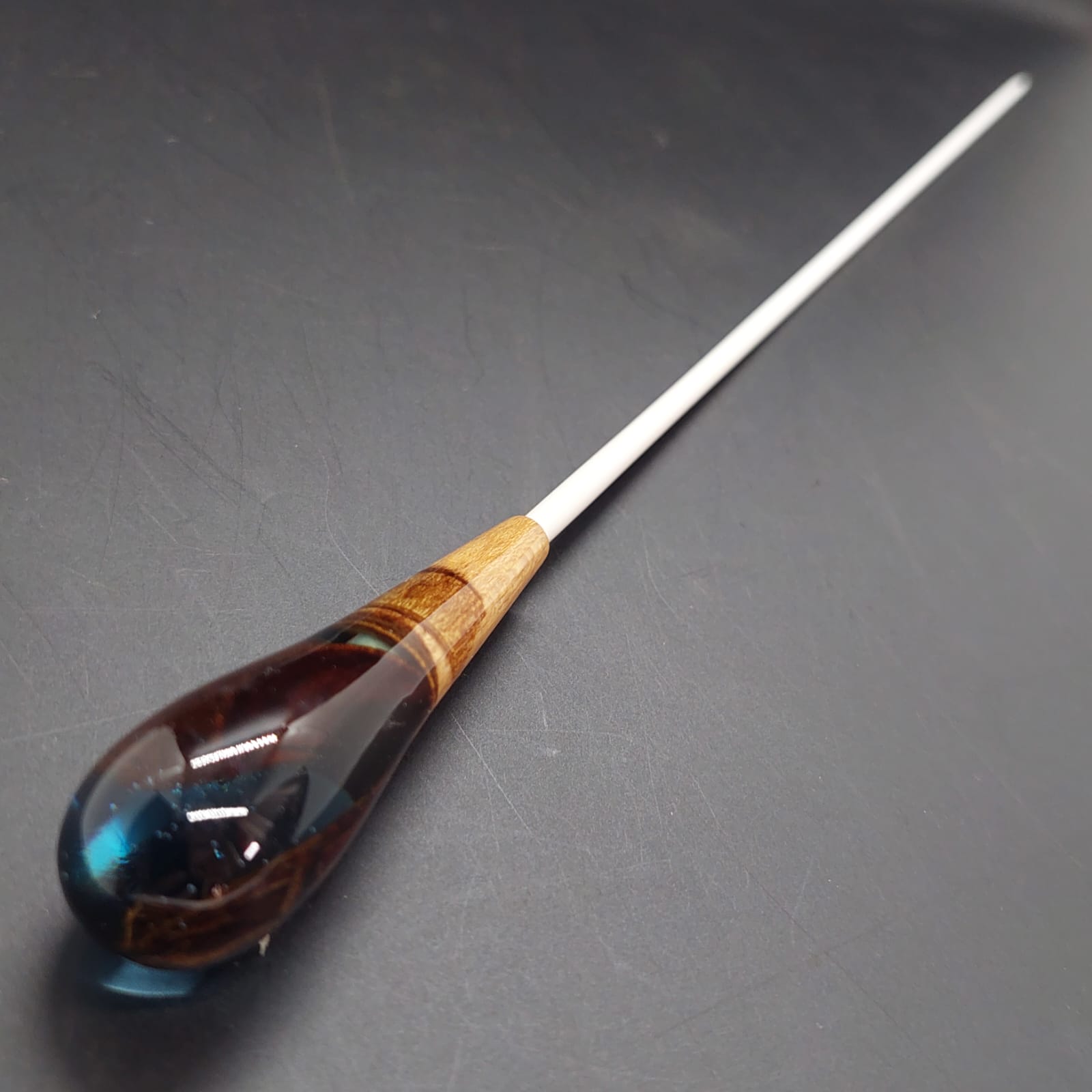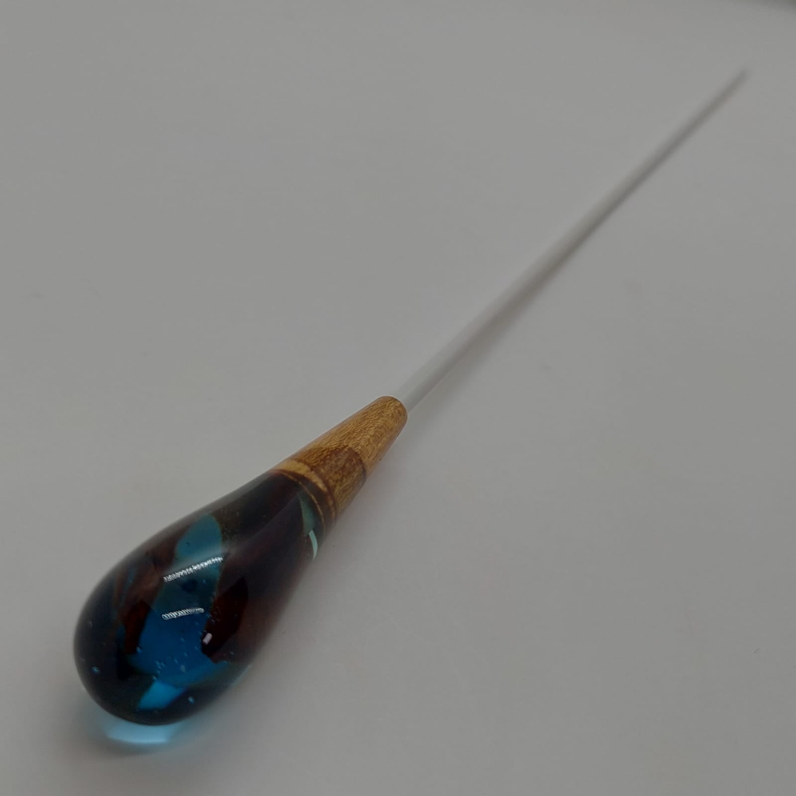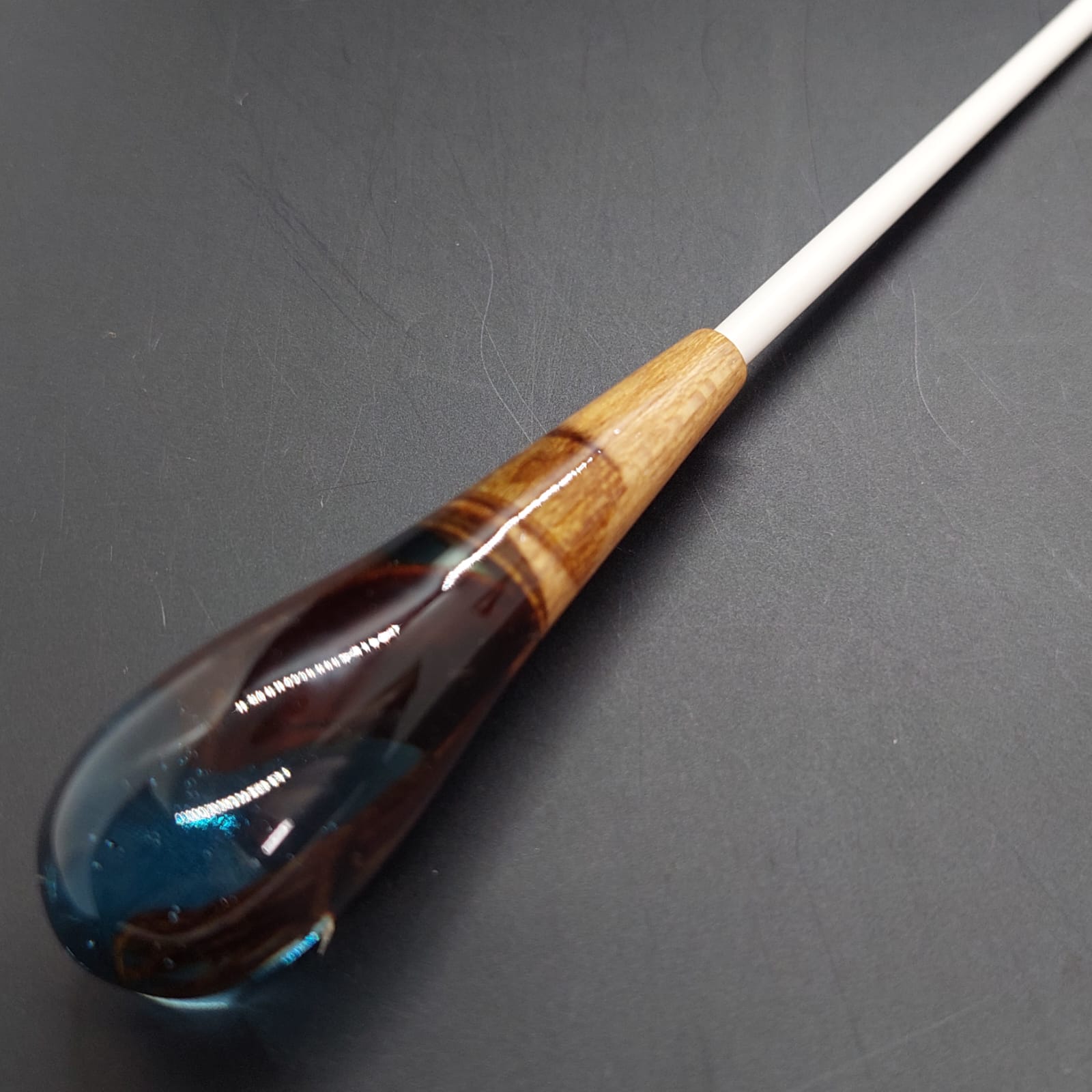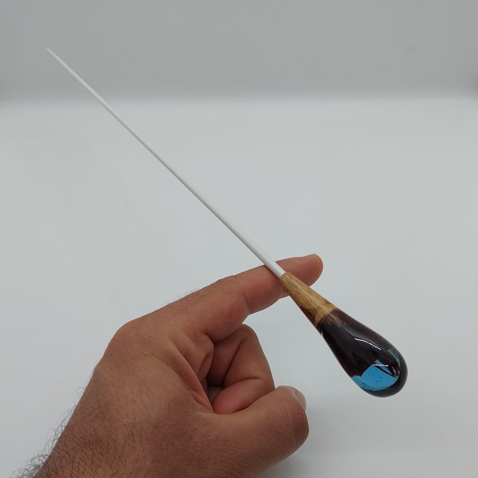 La pera de la batuta nace de la fusión entre la nobleza de la madera y el brillo translúcido de la resina, creando una obra de arte única en cada pieza. Cada batuta presenta matices y detalles singulares, garantizando resistencia, calidad y un toque sofisticado y elegante.
