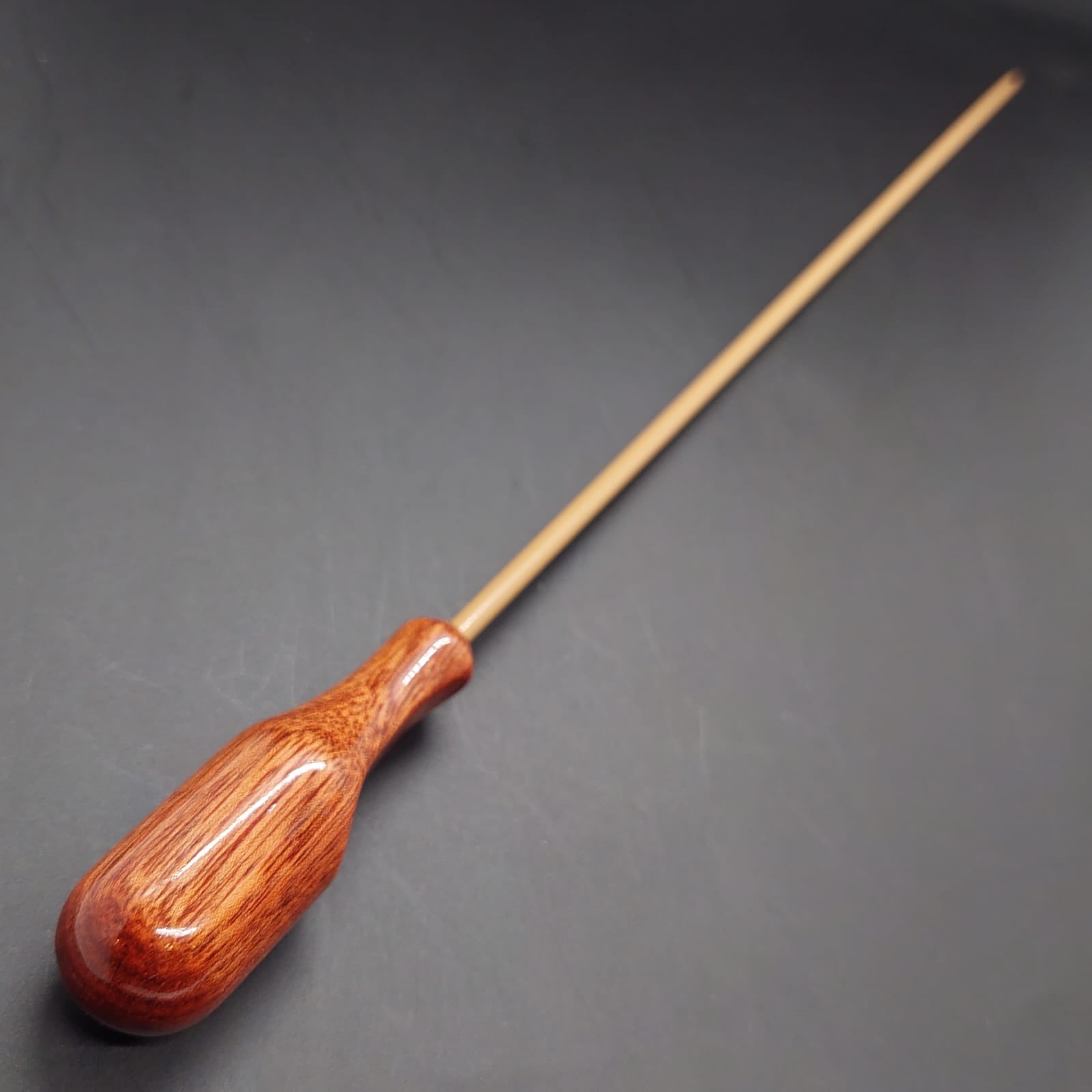 A pera da batuta é produzida em madeira de alta qualidade, resistente e cuidadosamente selecionada para garantir durabilidade e beleza. Seu acabamento realça os veios naturais da madeira, valorizando sua textura única e assegurando que a batuta se destaque com elegância e autenticidade.