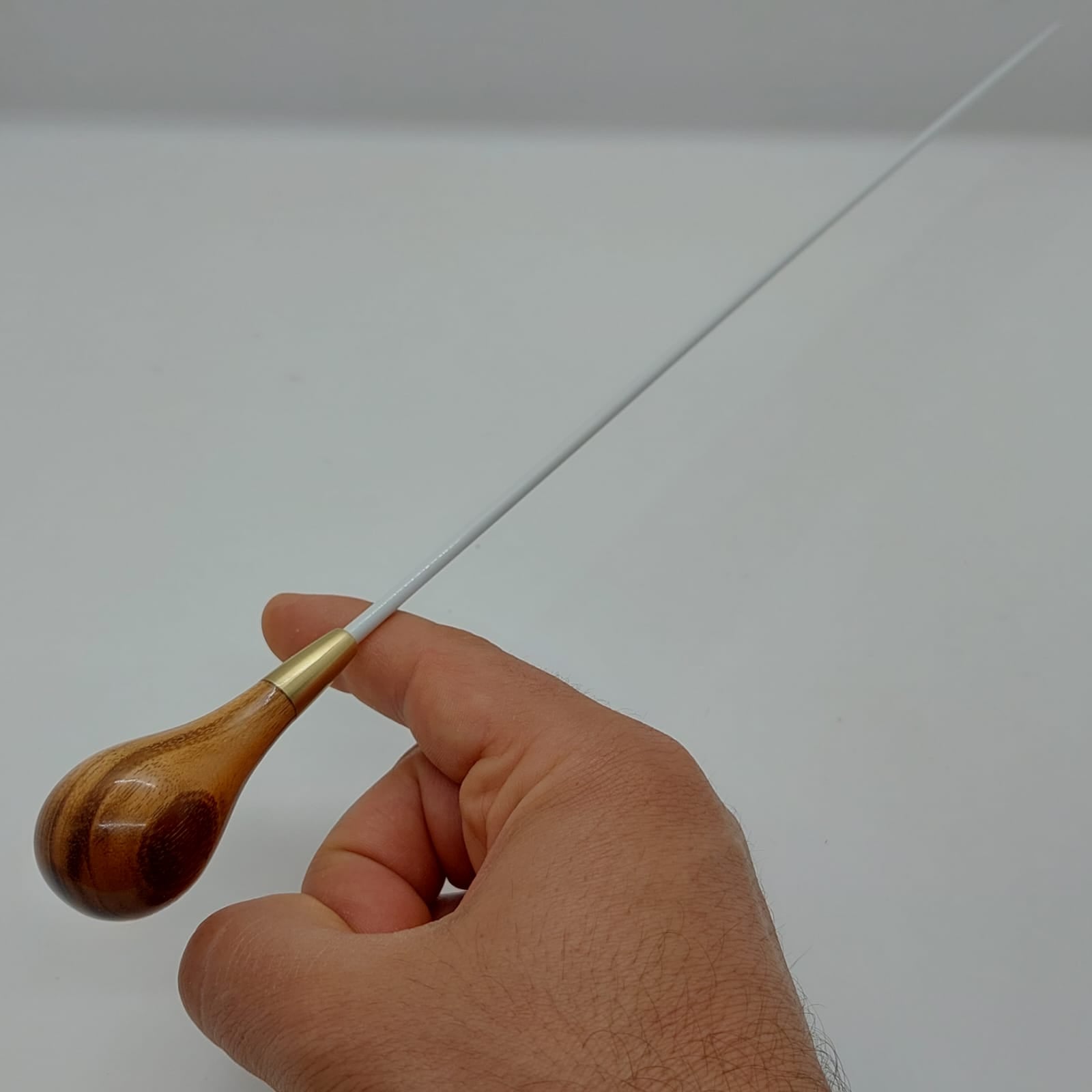 Batuta de maestro com empunhadura modelo Clássico Bolinha, de formato arredondado e encorpado, esculpida para um encaixe firme e confortável dos dedos, aliando presença e elegância a cada gesto.