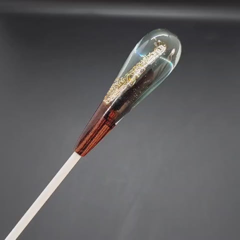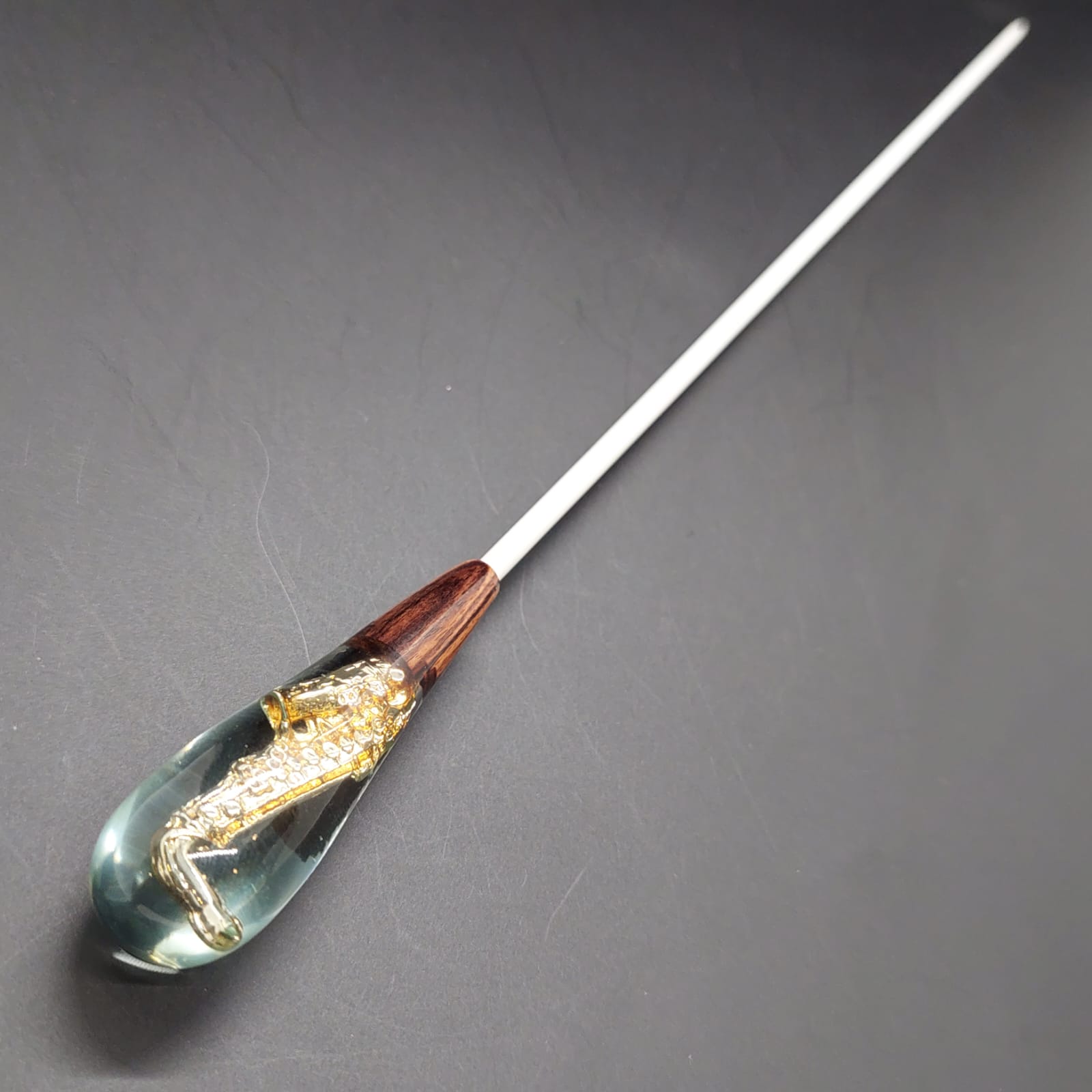 A pera da batuta é composta por uma delicada fusão entre madeira e resina, trazendo em seu interior a miniatura de um instrumento musical. Cada peça é única, revelando detalhes encantadores que homenageiam a música, unindo resistência, originalidade e um toque de sofisticação à regência.