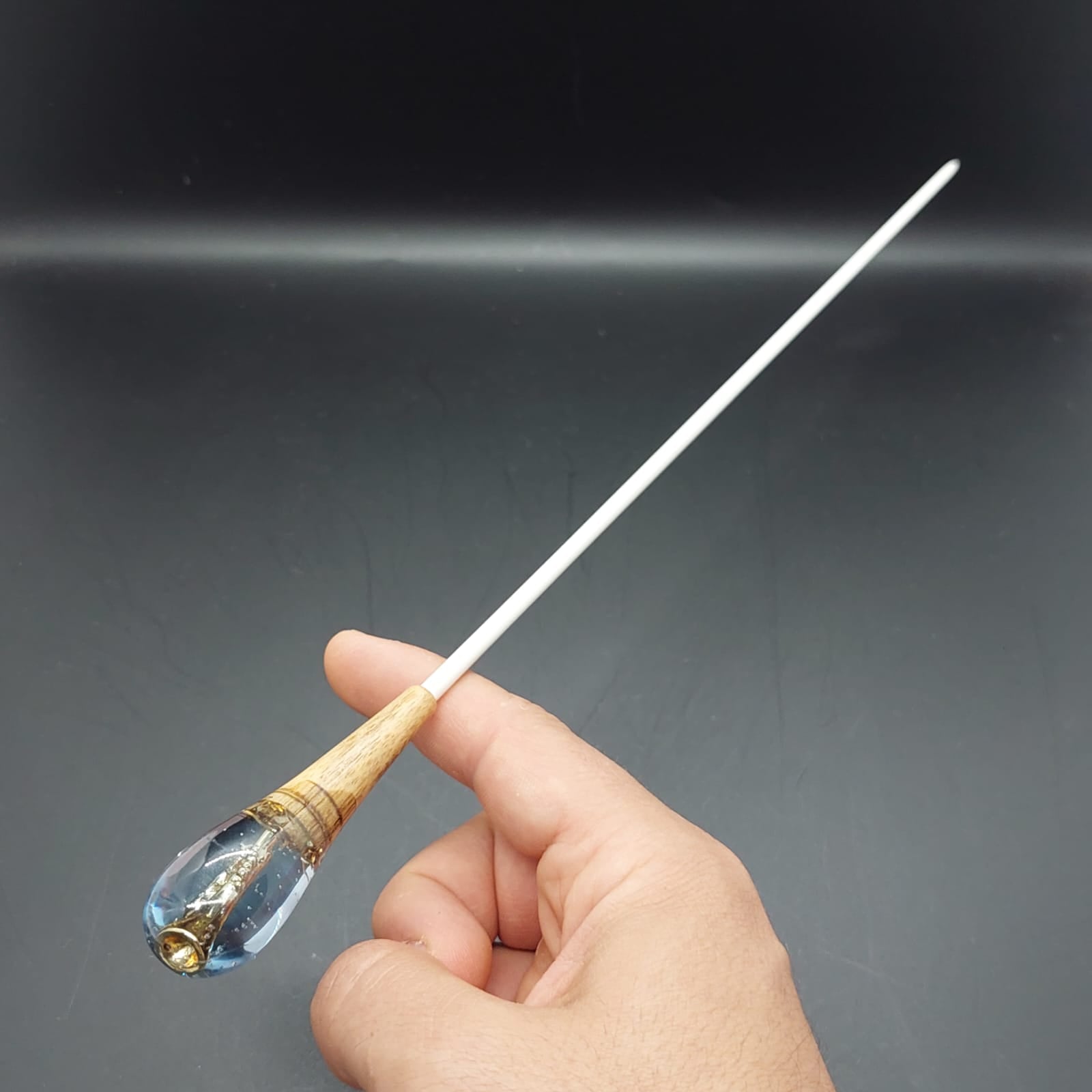 Batuta de maestro com empunhadura modelo Clássico, finamente esculpida para um encaixe harmonioso dos dedos, oferecendo conforto e elegância em cada movimento.