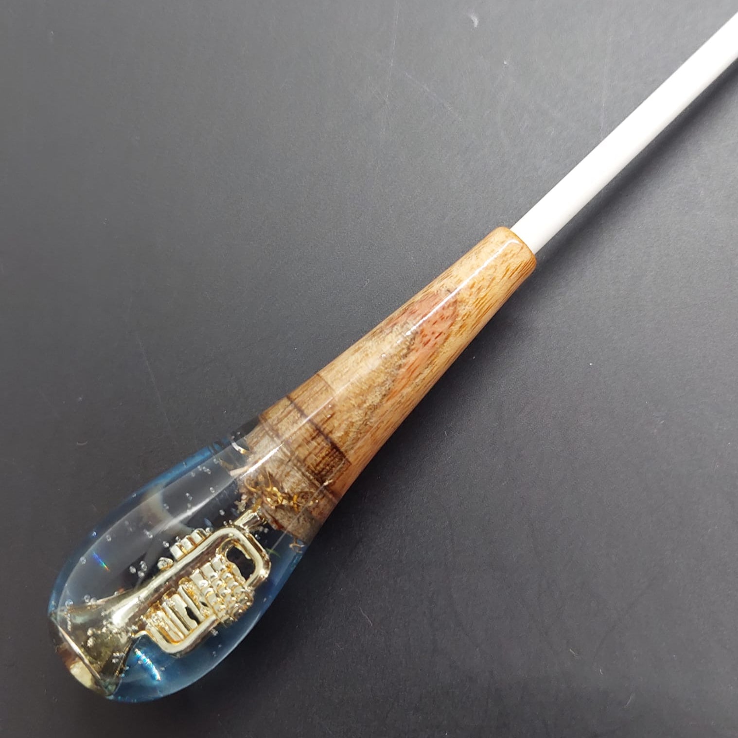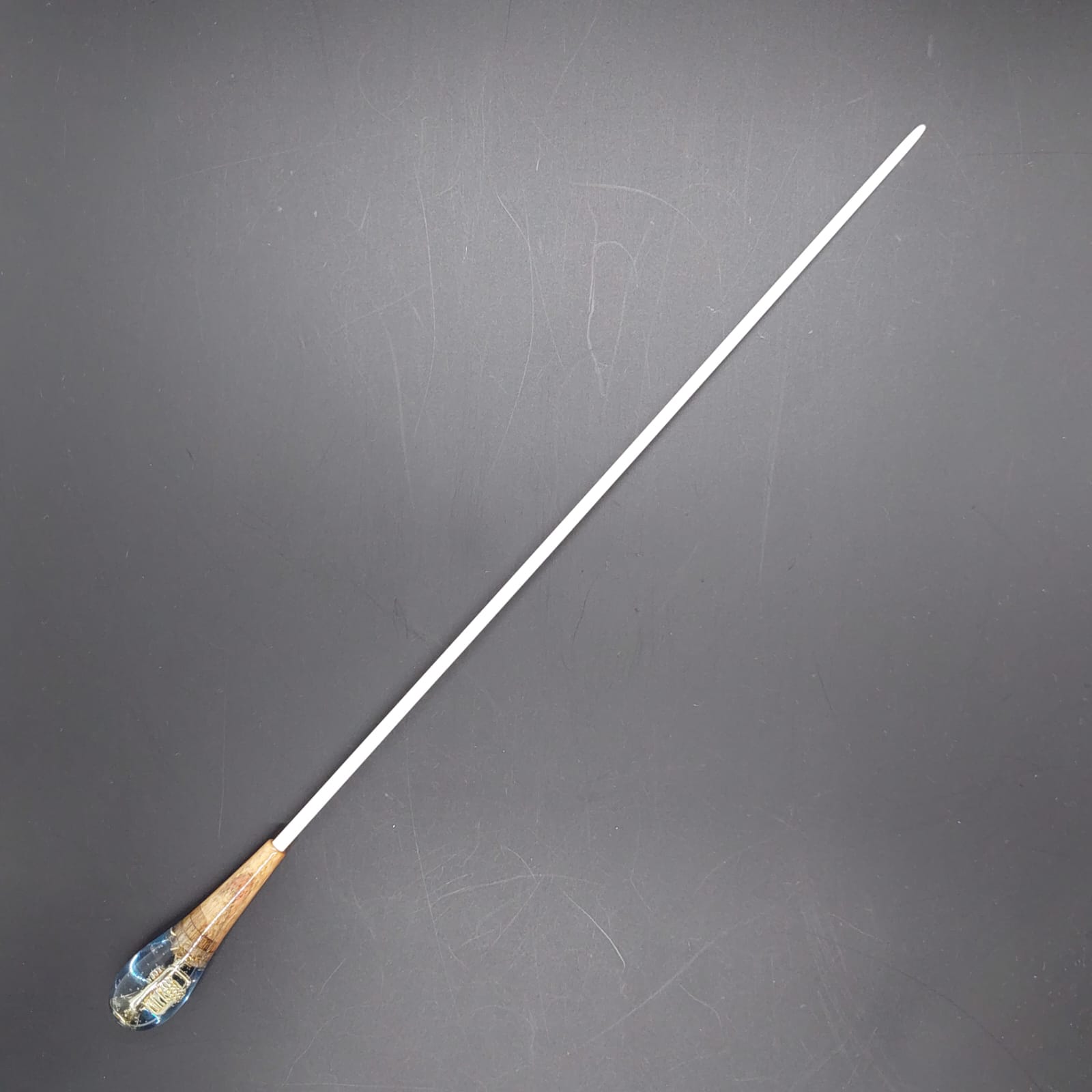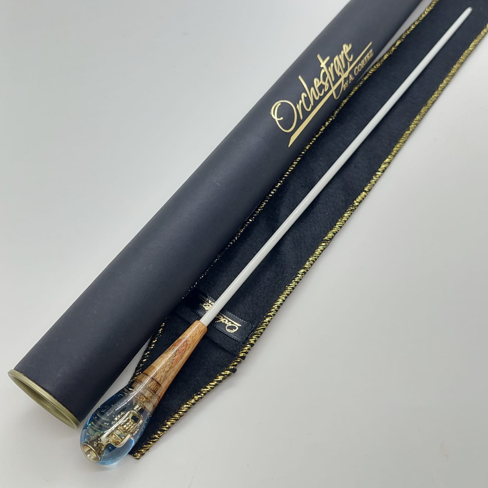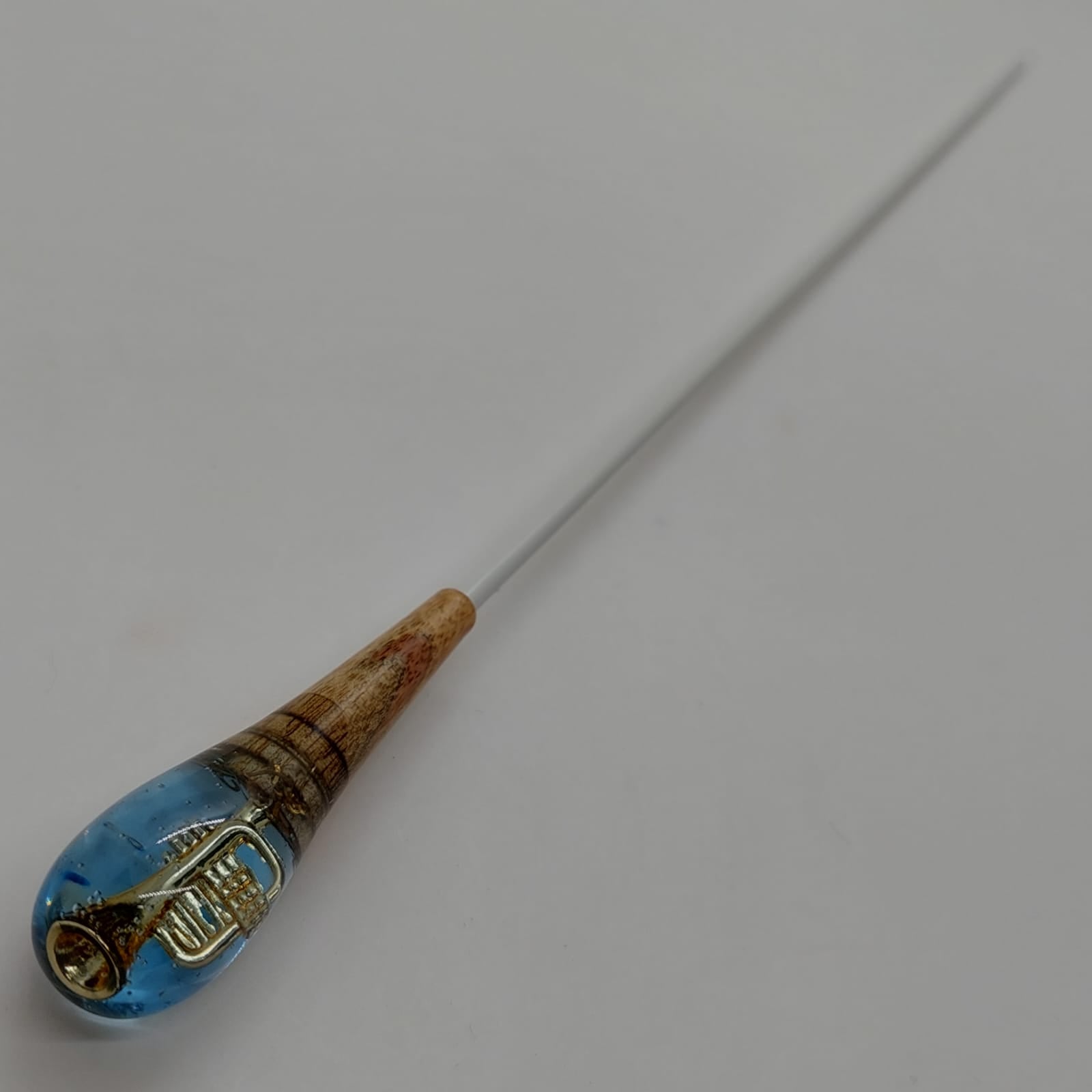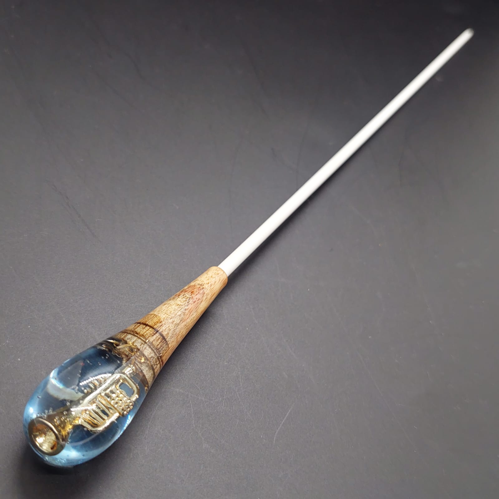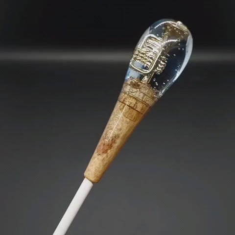 A pera da batuta é composta por uma delicada fusão entre madeira e resina, trazendo em seu interior a miniatura de um instrumento musical. Cada peça é única, revelando detalhes encantadores que homenageiam a música, unindo resistência, originalidade e um toque de sofisticação à regência.
