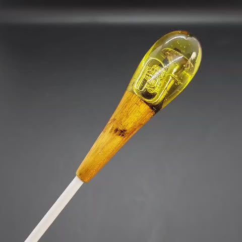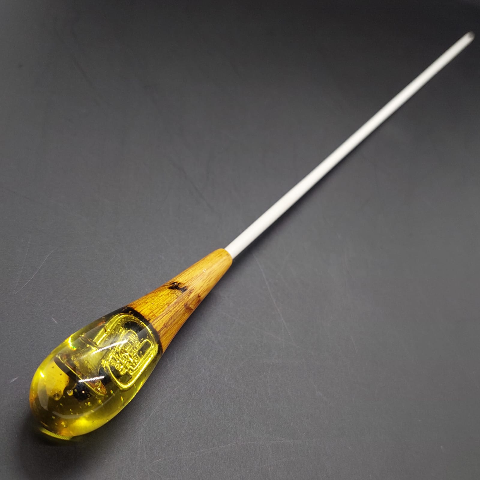 A pera da batuta é composta por uma delicada fusão entre madeira e resina, trazendo em seu interior a miniatura de um instrumento musical. Cada peça é única, revelando detalhes encantadores que homenageiam a música, unindo resistência, originalidade e um toque de sofisticação à regência.