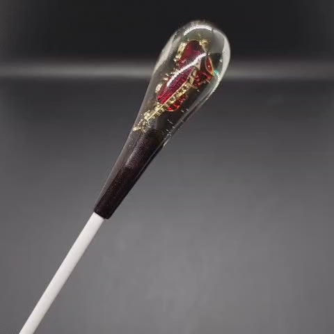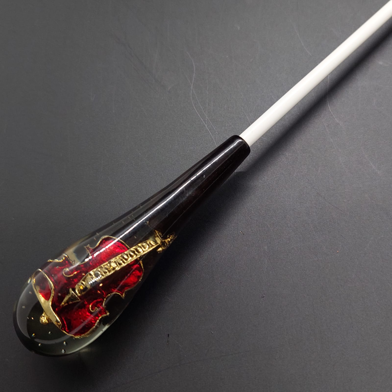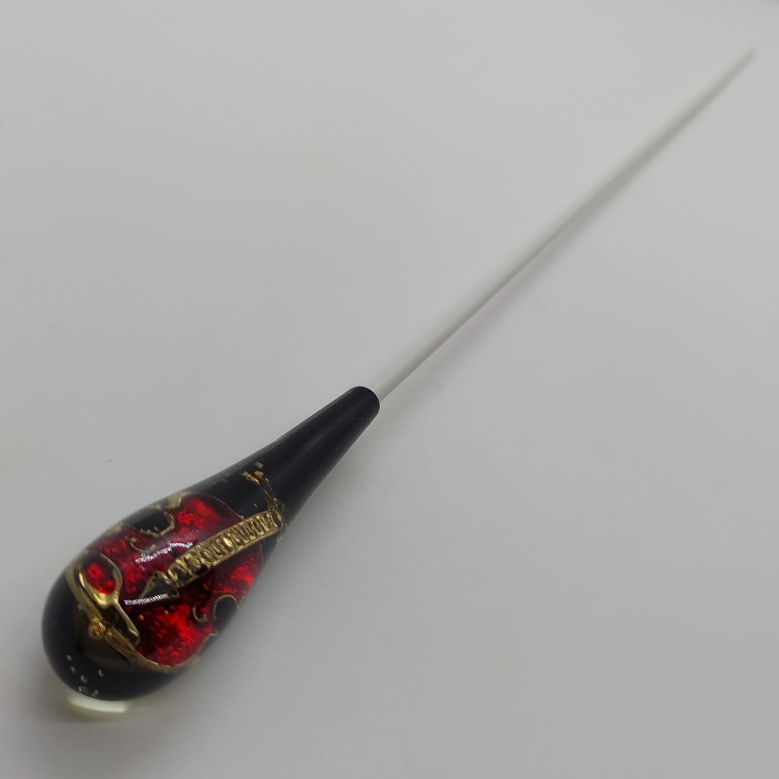 A pera da batuta é composta por uma delicada fusão entre madeira e resina, trazendo em seu interior a miniatura de um instrumento musical. Cada peça é única, revelando detalhes encantadores que homenageiam a música, unindo resistência, originalidade e um toque de sofisticação à regência.