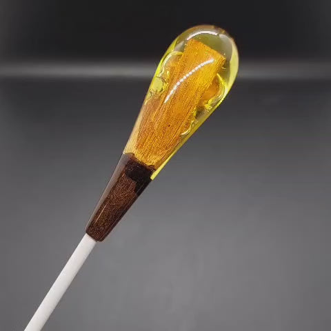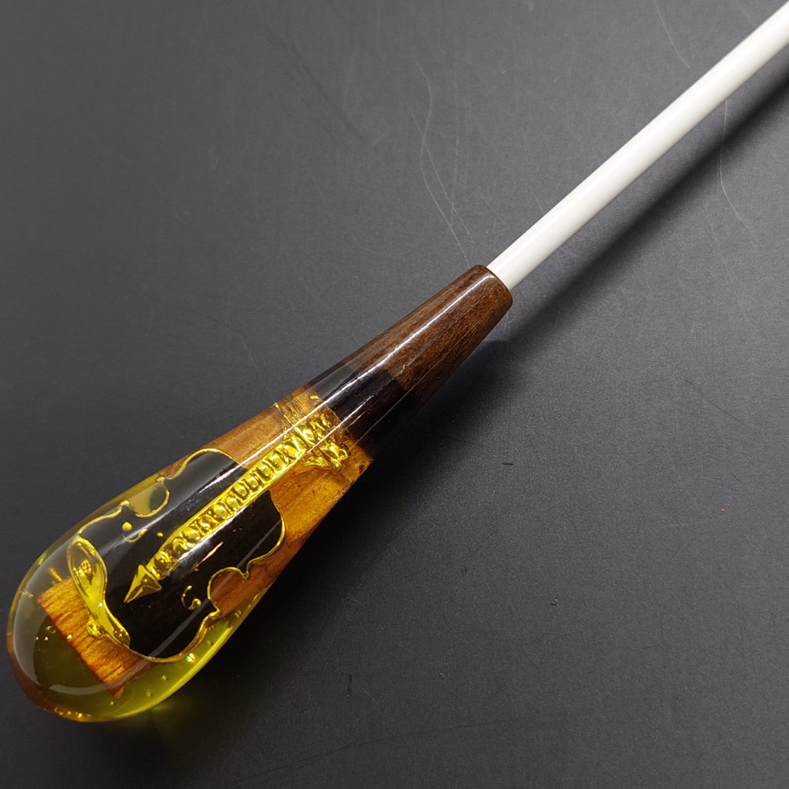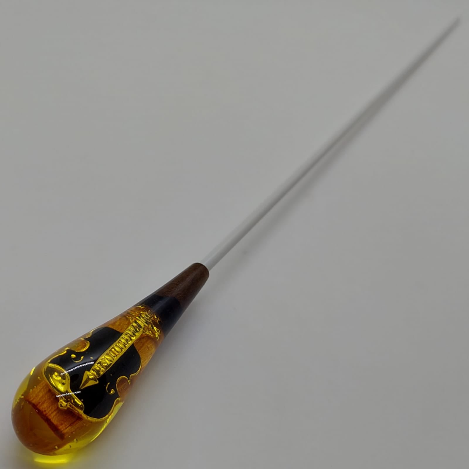 A pera da batuta é composta por uma delicada fusão entre madeira e resina, trazendo em seu interior a miniatura de um instrumento musical. Cada peça é única, revelando detalhes encantadores que homenageiam a música, unindo resistência, originalidade e um toque de sofisticação à regência.