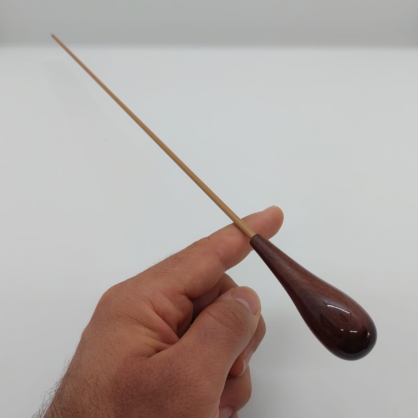 Batuta de maestro com empunhadura modelo Clássico, finamente esculpida para um encaixe harmonioso dos dedos, oferecendo conforto e elegância em cada movimento.