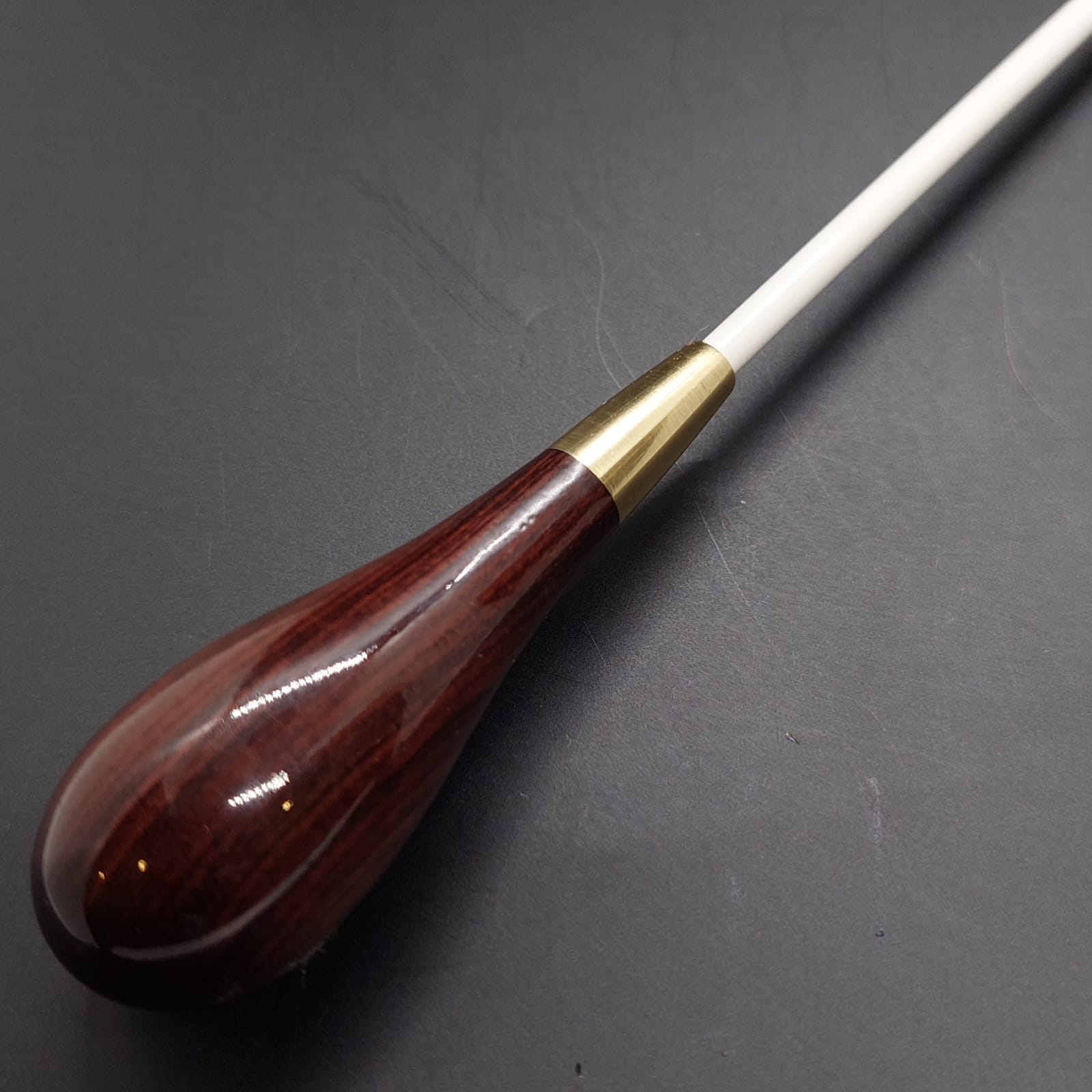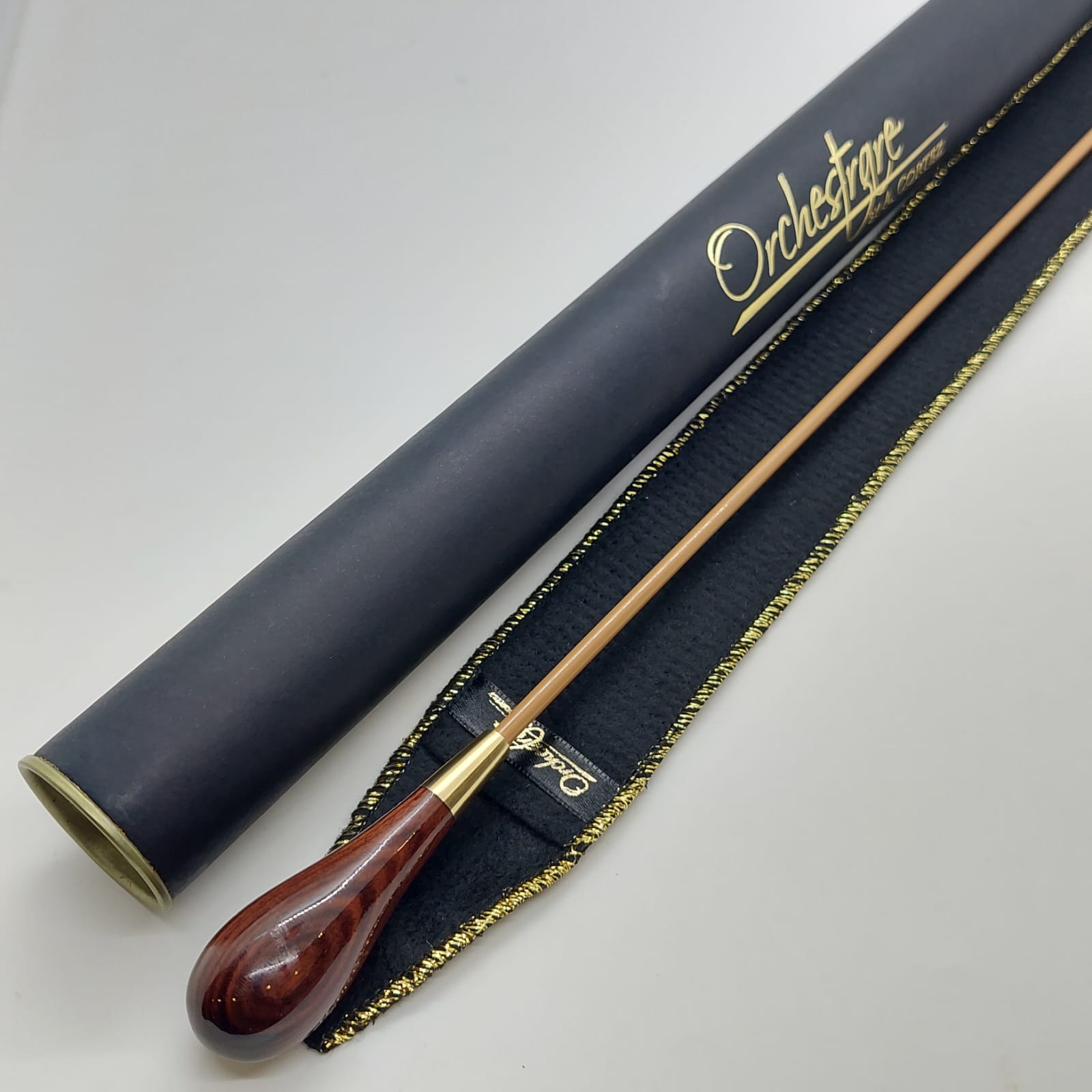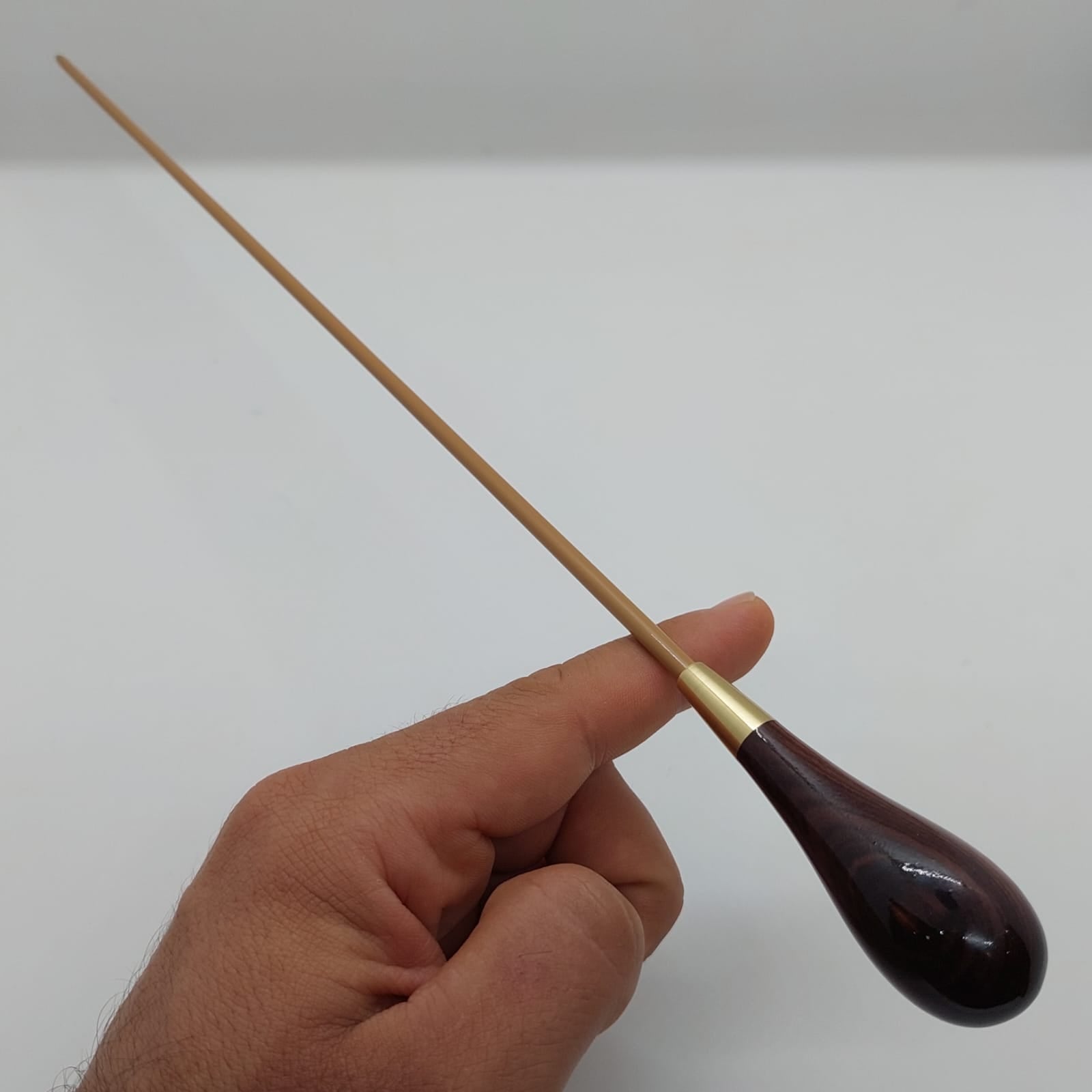 Batuta de maestro com empunhadura modelo Clássico, finamente esculpida para um encaixe harmonioso dos dedos, oferecendo conforto e elegância em cada movimento.