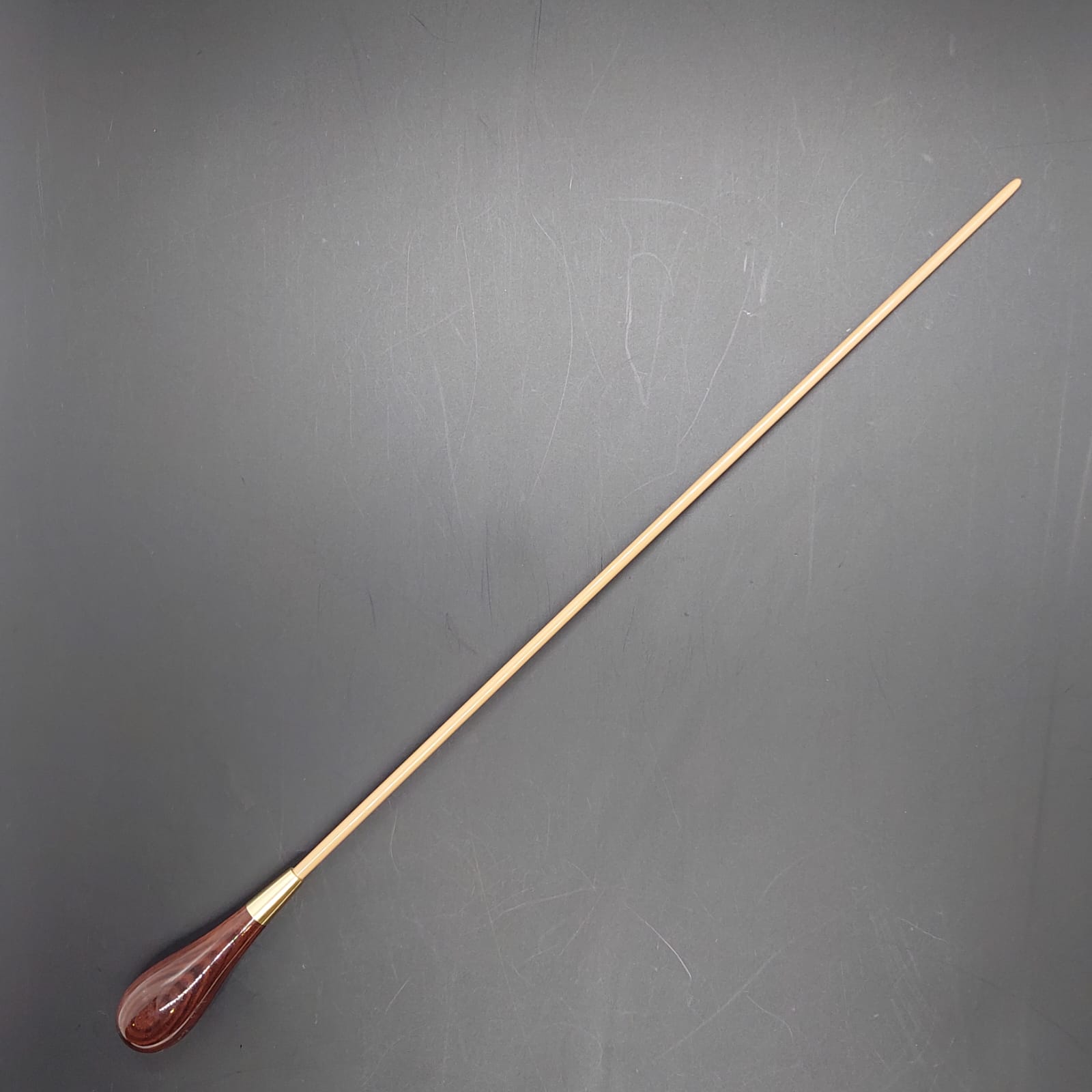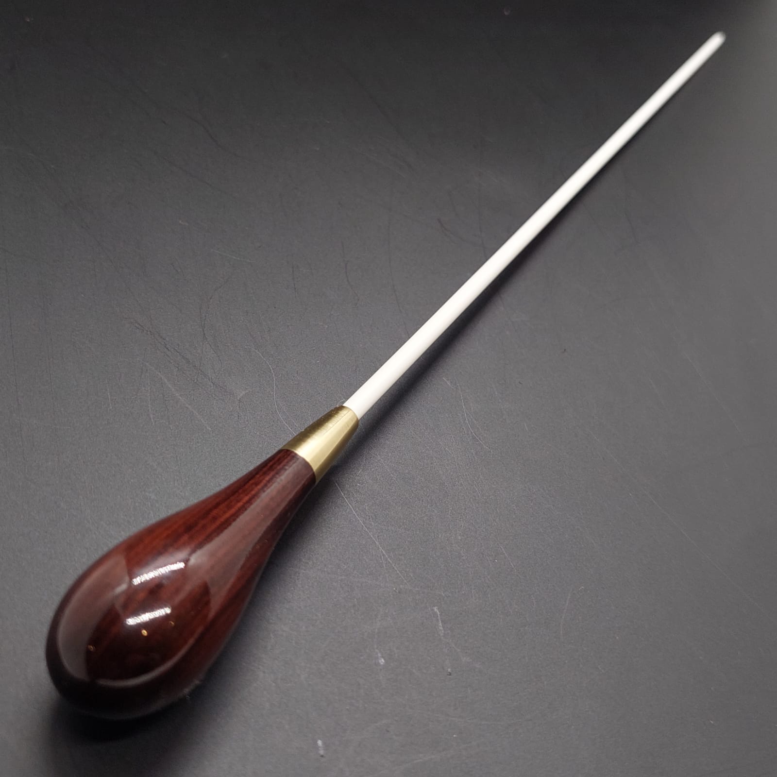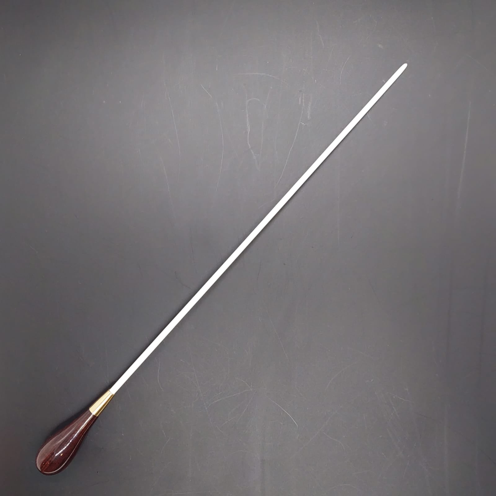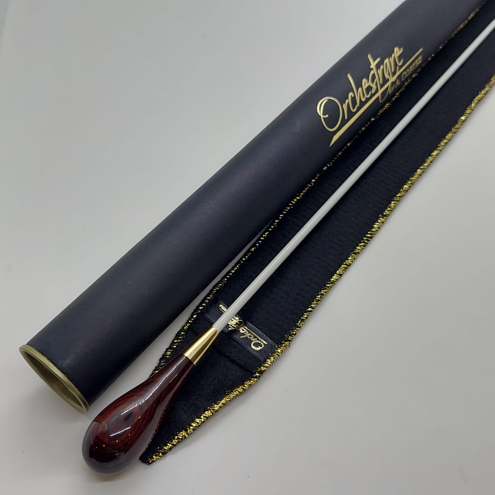 Batuta de maestro com empunhadura modelo Clássico, finamente esculpida para um encaixe harmonioso dos dedos, oferecendo conforto e elegância em cada movimento.