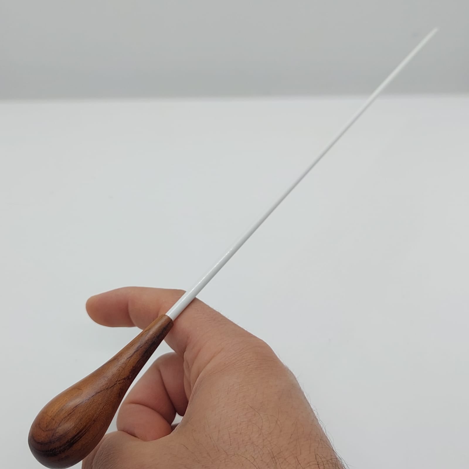 Batuta de maestro com empunhadura modelo Clássico, finamente esculpida para um encaixe harmonioso dos dedos, oferecendo conforto e elegância em cada movimento.