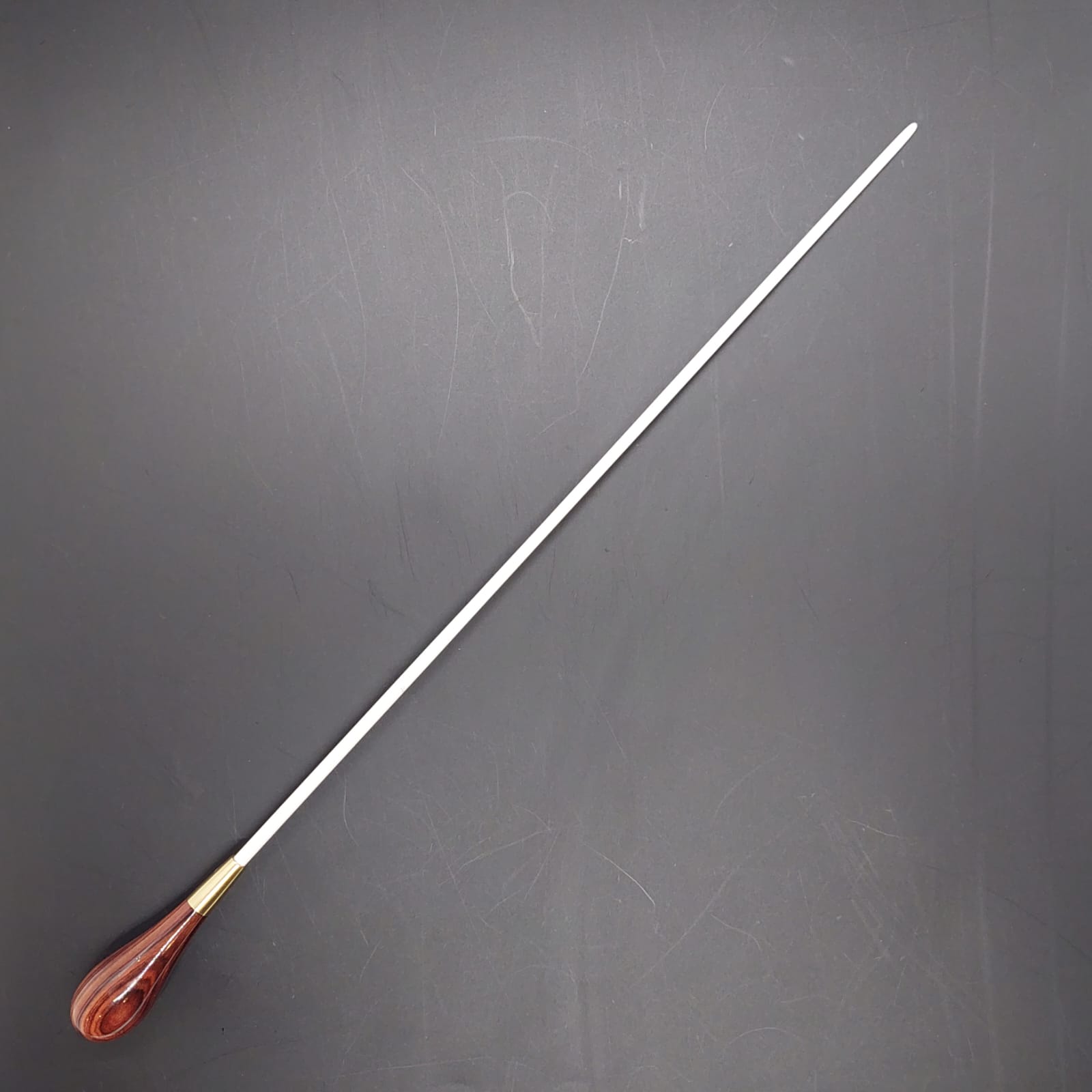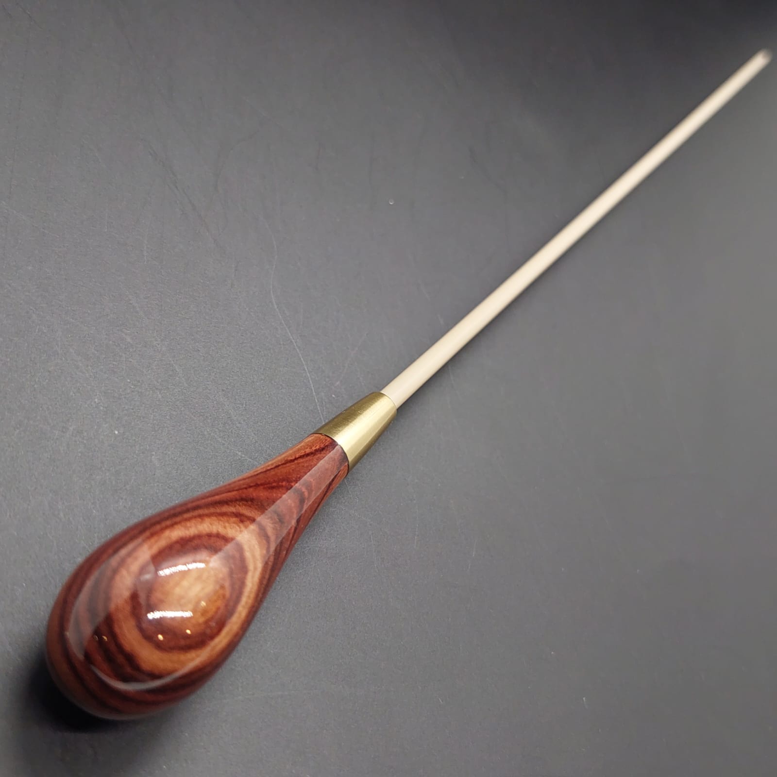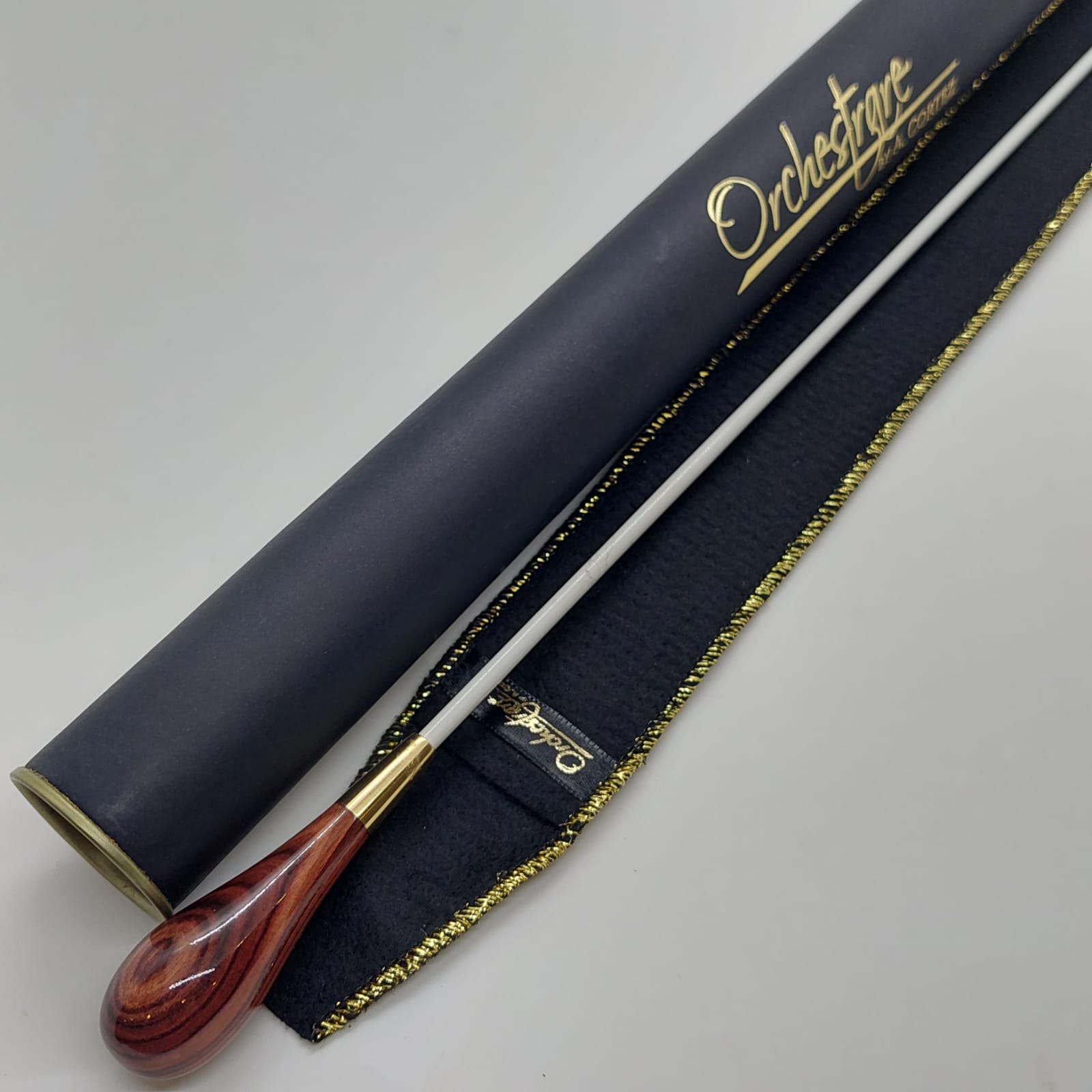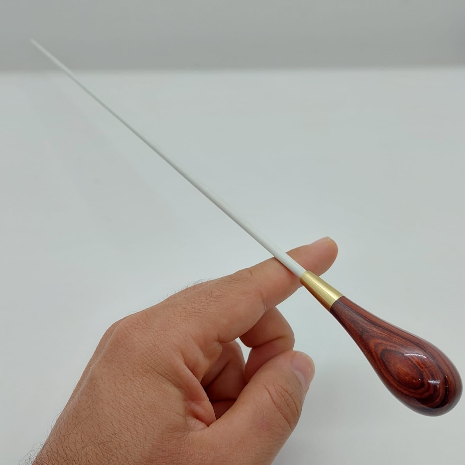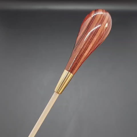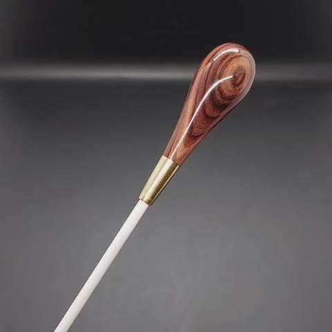Batuta de maestro com empunhadura modelo Clássico, finamente esculpida para um encaixe harmonioso dos dedos, oferecendo conforto e elegância em cada movimento.