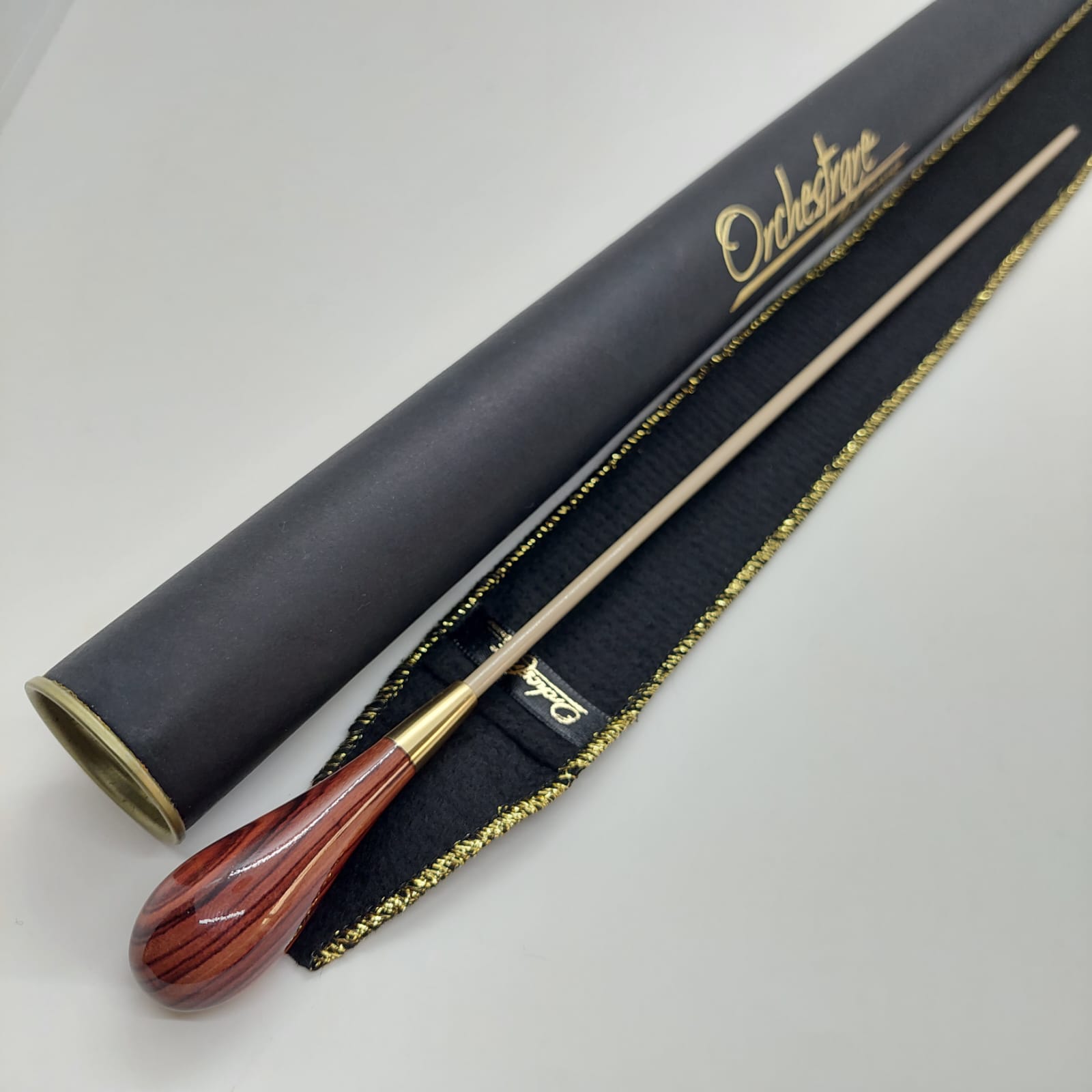 A pera da batuta é produzida em madeira de alta qualidade, resistente e cuidadosamente selecionada, combinada a detalhes em metal esculpido que realçam sua beleza e sofisticação. Essa união valoriza tanto a textura natural da madeira quanto o brilho refinado do metal, conferindo à batuta um visual elegante e único.
